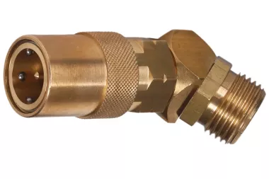 45° zásuvka DN 16 pro rychlospojku s vnějším závitem BSP, s ventilem. Široce se používá v průmyslu k chlazení vstřikovacích forem a odlitků z plastů, hliníku, mosazi a zinkových slitin. Lze použít pro vodu v čisticích strojích, pro horký olej, vodní páru. Série: TST 16. Provozní tlak: 20 bar. Materiál: mosaz (tělo zásuvky, přípojka, pouzdro, ventil), nerezová ocel (pružina, kroužek, kuličky). Provozní teplota: od -20°C do +200°C (viton).