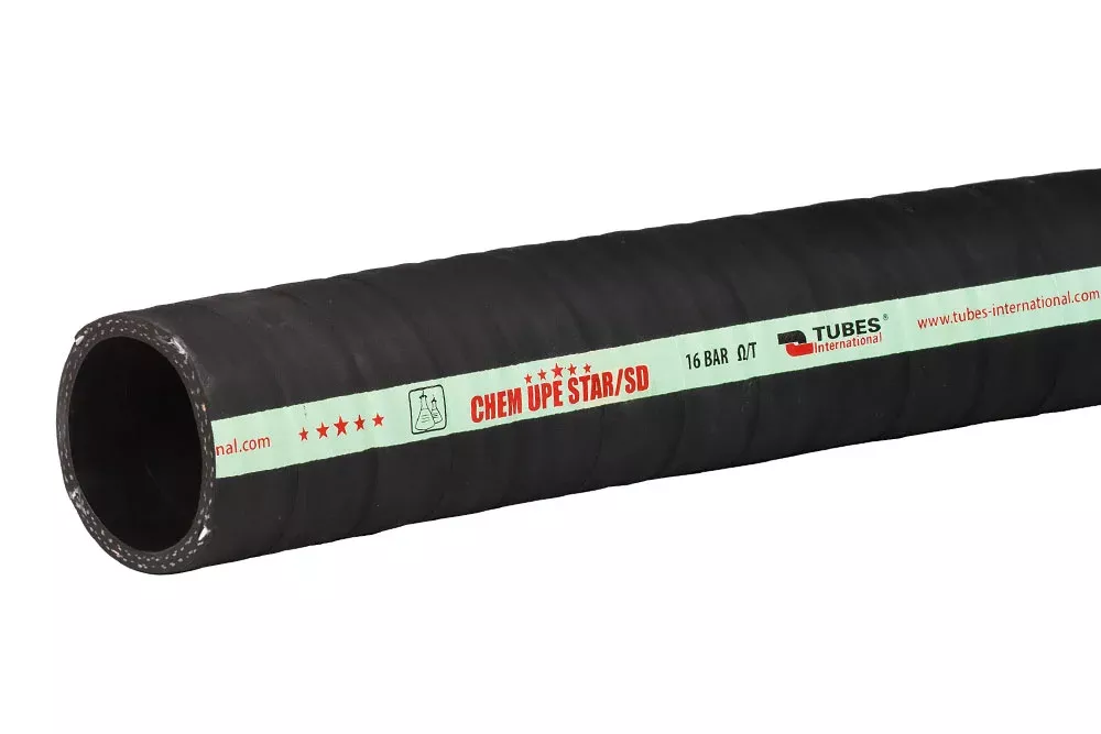 Gumová hadice CHEM STAR UPE/SD je osvědčená antistatická a ekonomická sací/tlaková hadice pro kyseliny a zásady, která nachází široké uplatnění v chemickém a petrochemickém průmyslu, při vykládce cisteren nebo při přepravě agresivních látek mezi nádržemi.