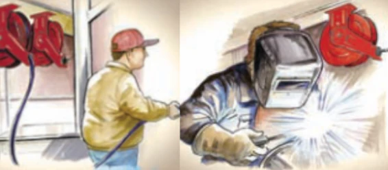 - Maximální délka hadice je omezena kapacitou cívky (průměr a šířka) pro hadici s daným vnějším průměrem a v případě automatických pružinových navijáků maximálním napětím (počet otáček) možné pružiny.