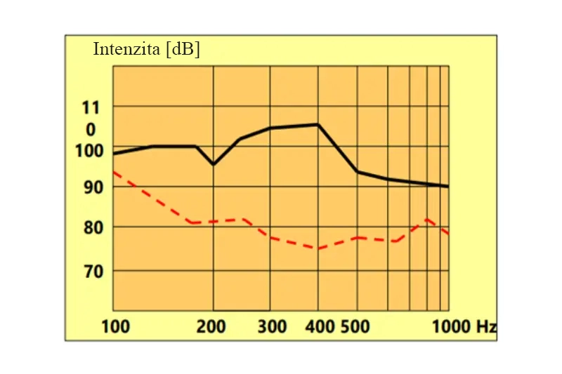 Graf znázorňuje efekt tlumení vibrací pryžovým kompenzátorem. Přerušovaná čára ukazuje úroveň intenzity vibrací po instalaci kompenzátoru. (dle údajů společnosti Trelleborg)